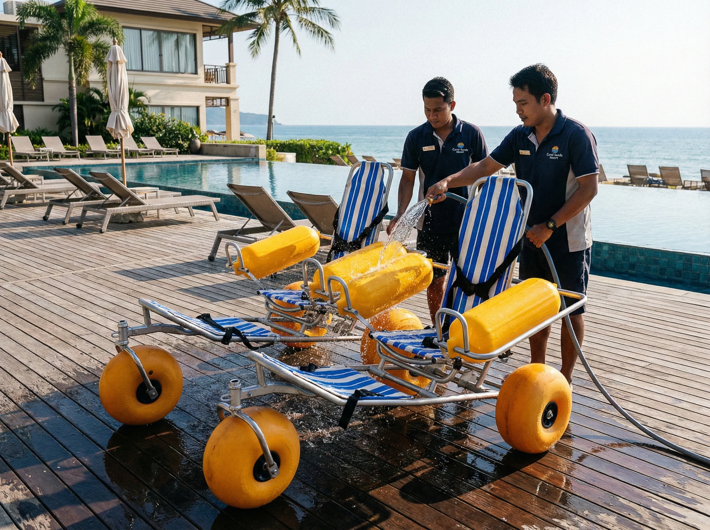 "Metal chairs sink immediately. Without buoyancy, entering the water is dangerous and creates a severe drowning risk."