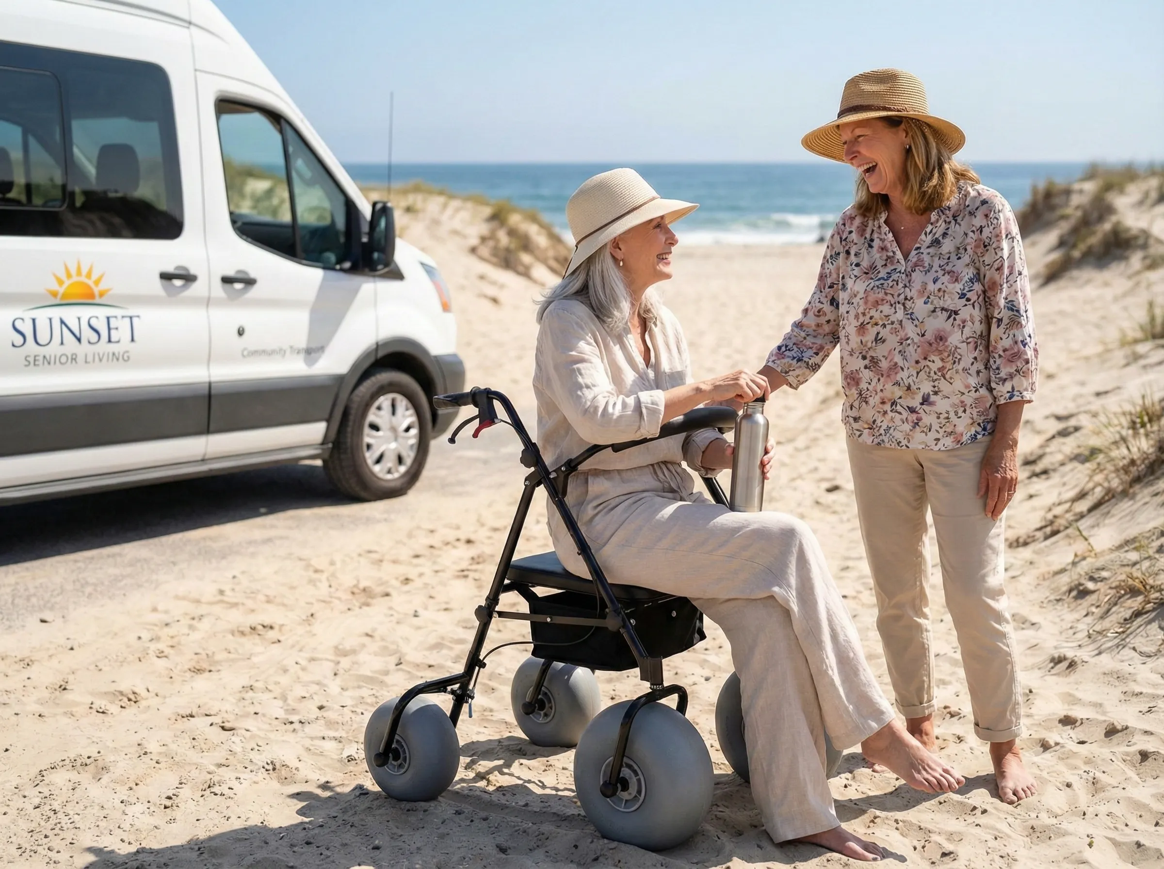 Retirement communities organize safe beach excursions using Beach Walkers, allowing residents to maintain active lifestyles and enjoy therapeutic coastal environments.
