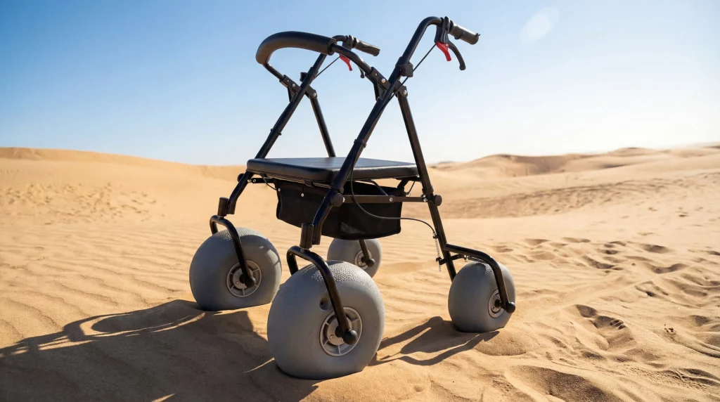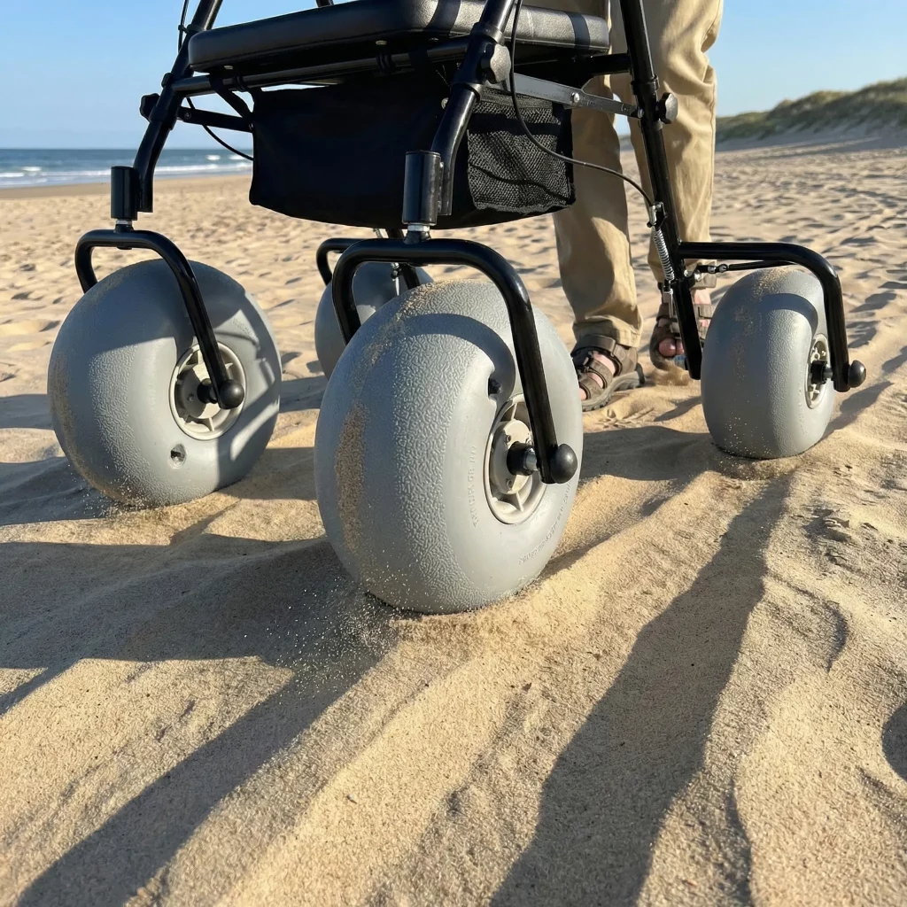 Key Takeaway: High-flotation tires are the primary factor that allows a rollator to function on a beach.