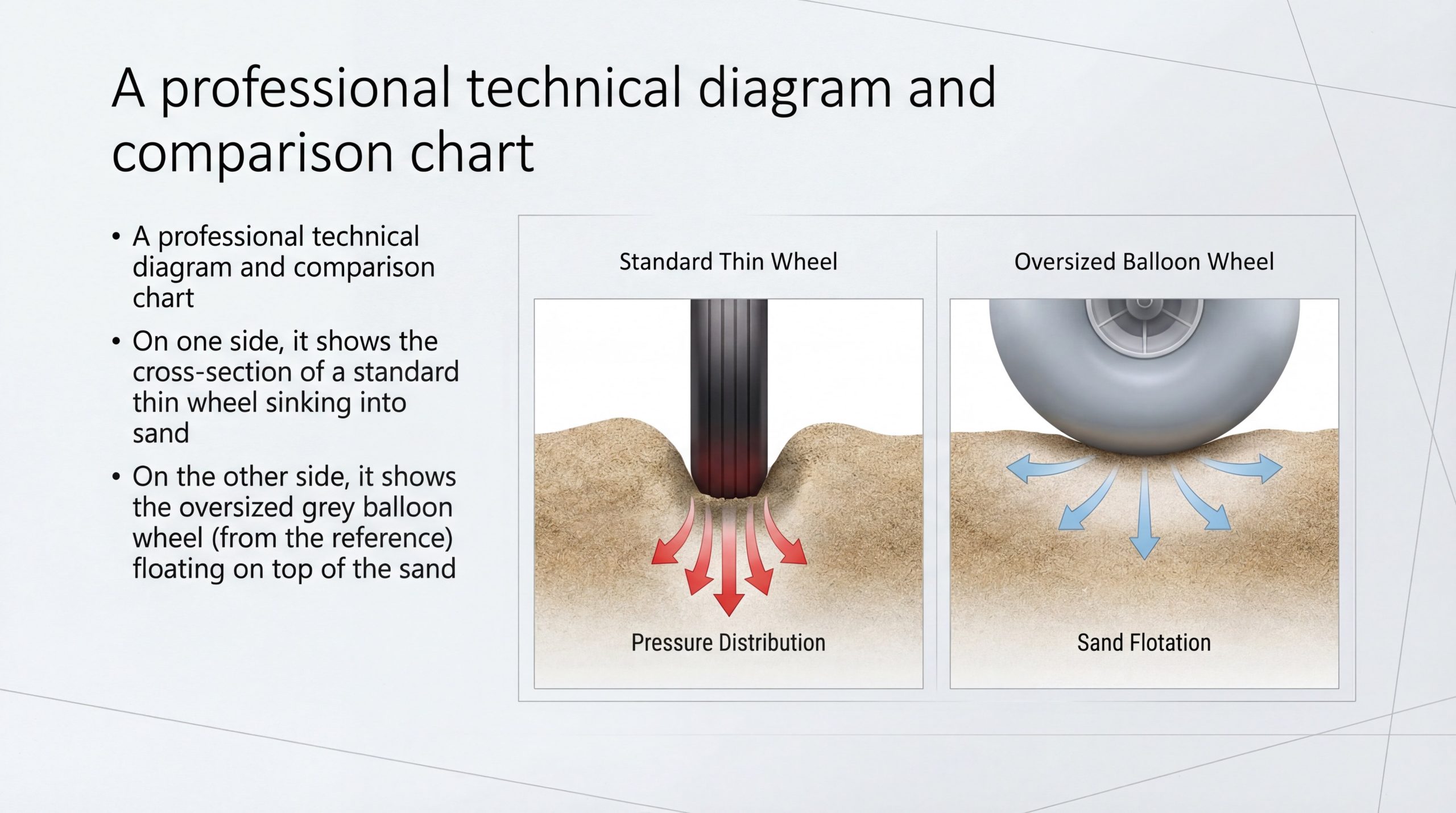 Standard wheels are simply too narrow to handle the shifting nature of coastal dunes. You need a design that prioritizes surface area to keep you moving forward.