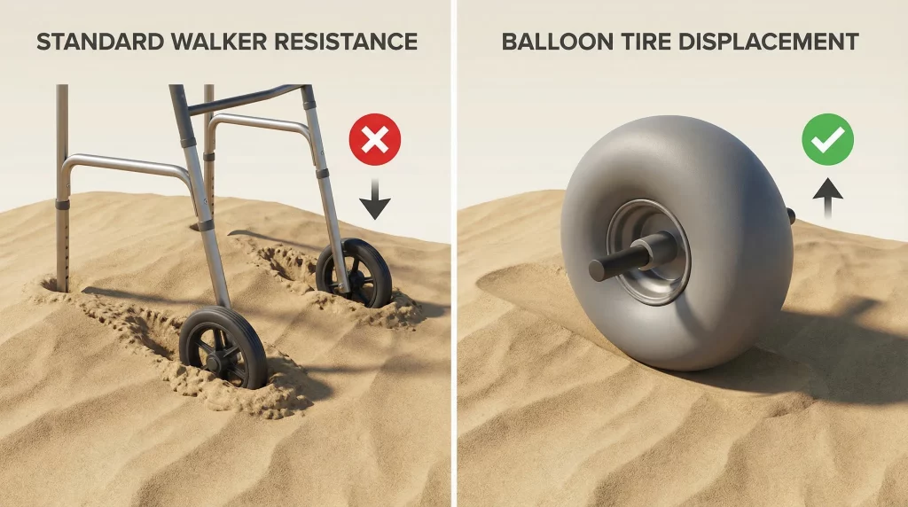 Standard mobility aids are optimized for friction on tile, not flotation on coastal soil.