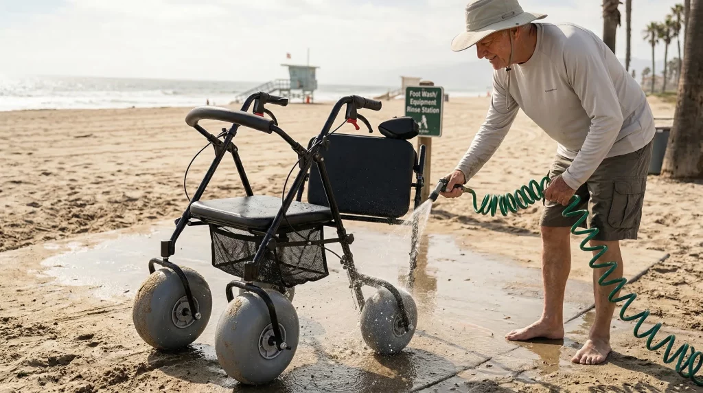 Rinsing your walker with fresh water after every trip is the single most important maintenance step. Salt and sand can act as abrasives that wear down moving parts and joints over time.