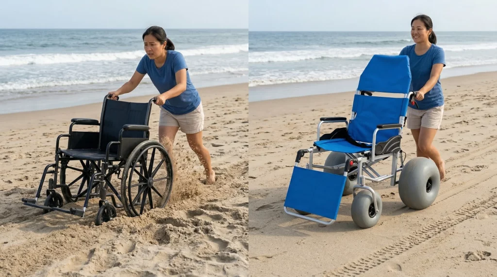 Key Takeaway: Standard wheelchairs are built for efficiency on hard floors, whereas beach models are built for flotation and environmental resilience.