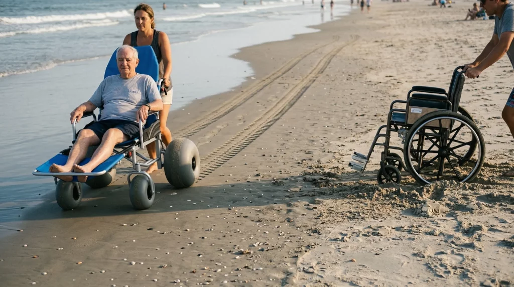 You generally cannot use a standard wheelchair on the beach because the narrow tires will sink immediately into the sand, making wheelchair beach access impossible without extreme effort. Even if you manage to push across a small patch of wet sand, the salt and grit will likely ruin your bearings and frame. It is far safer and more effective to transition to a specialized chair at the boardwalk.
