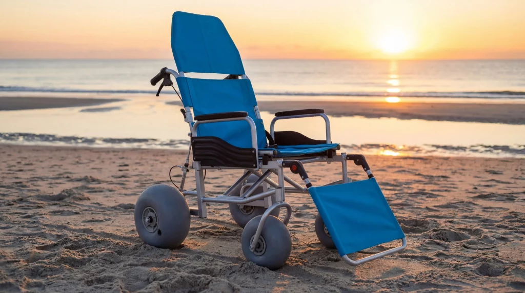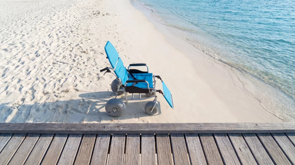 What’s the best way to reach the water if the mat stops short?The most effective solution is an all-terrain beach chair with balloon tires. This equipment is designed to float over the “gap” that mats cannot legally or physically bridge.