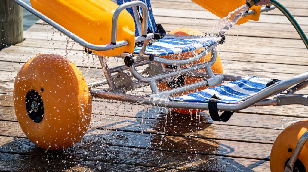 What’s the best way to clean the wheelchair after saltwater use?Use a standard garden hose. You should spray down the entire unit with fresh water, paying close attention to the axles, brake mechanisms, and the underside of the seat fabric where salt crystals tend to hide and cause damage.