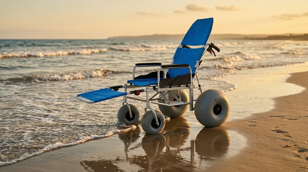 A floating beach wheelchair is the superior choice for water because it integrates buoyancy directly into the frame, allowing the user to float safely in a seated position. These chairs are not just “water-resistant”; they are truly amphibious, designed to transition from the shore into the surf without any hesitation. The engineering focus on buoyancy ensures that the user stays upright and stable even when the ground disappears beneath them.