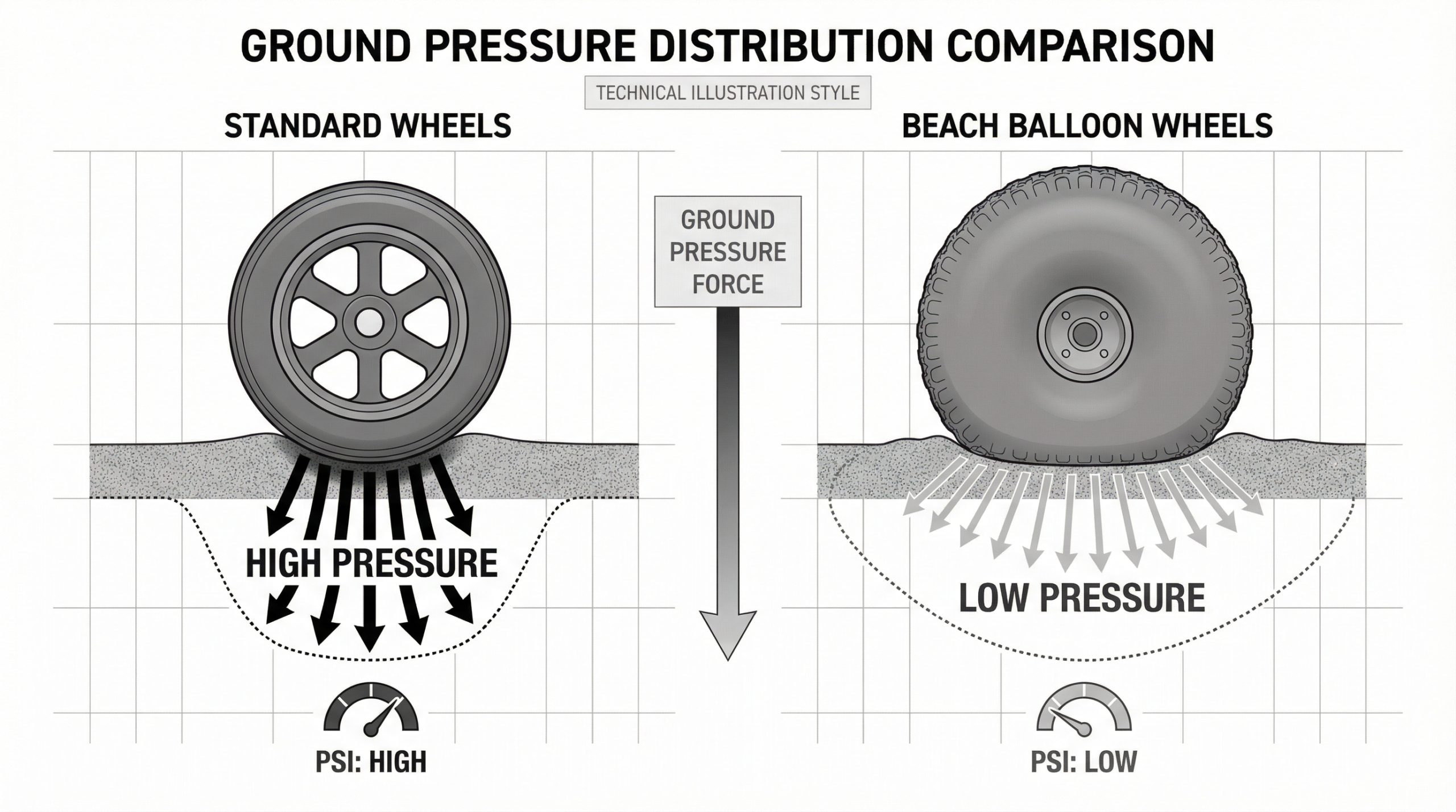 | Wheel Type | Pressure Distribution | Sand Performance |