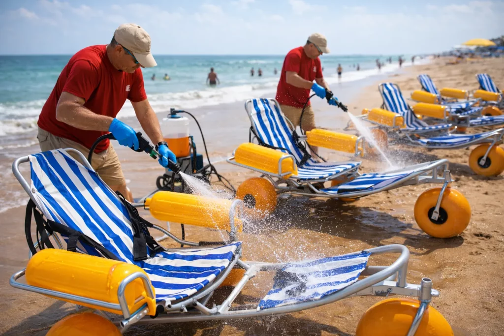 Saltwater is highly corrosive, meaning maintenance is the key to longevity for any floating beach wheelchair rental. Even marine-grade materials require a freshwater rinse after every use to remove salt crystals and fine sand. If left unattended, salt can seize bearings and degrade the finish of the frame.