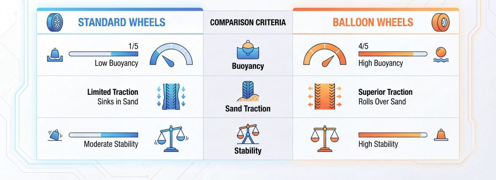 Key Takeaway: Balloon tires are the essential component that enables a chair to navigate both soft dunes and ocean waves.
