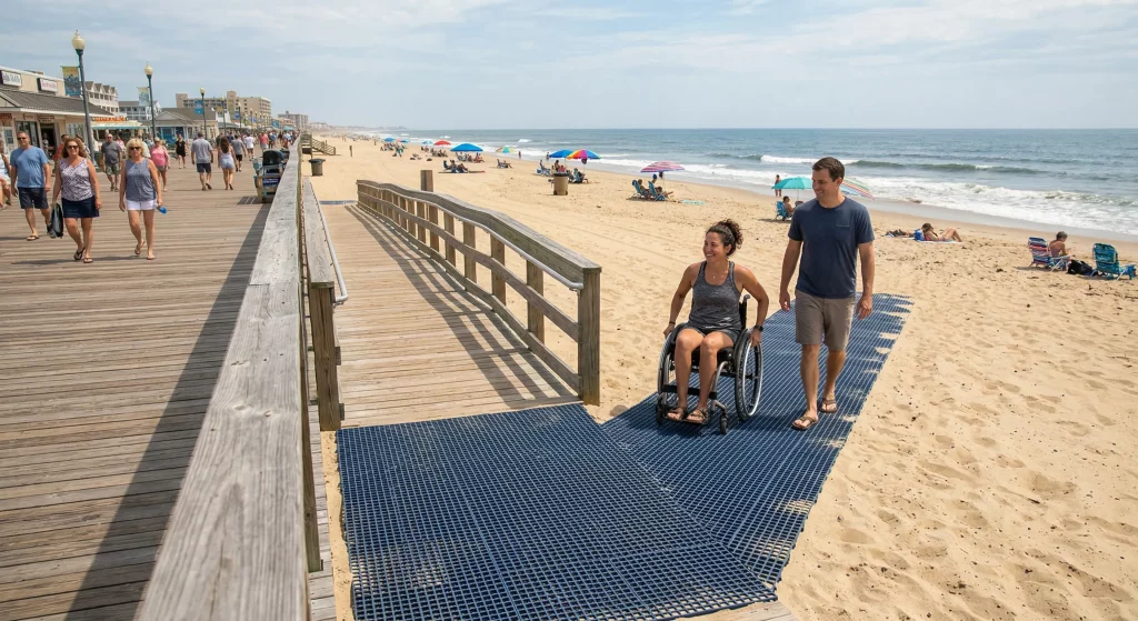 Gulf Shores is perfect due to its 20-foot wide concrete promenade and comprehensive mat system. The city prioritizes space and ease of movement for large power chairs. Investing in wheelchair beach access has made this a top choice for families needing extra room.