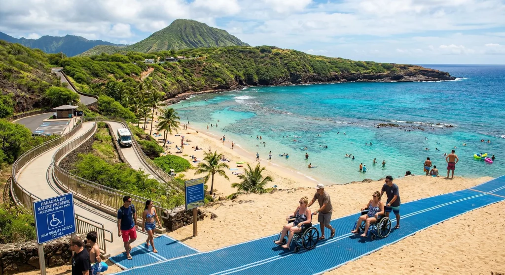Hanauma Bay leads through its integrated transport system and extensive mat coverage. This iconic destination ensures that the steep descent to the shore is no longer a barrier for visitors. Providing high-quality wheelchair beach access is a top priority for this Hawaiian preserve.