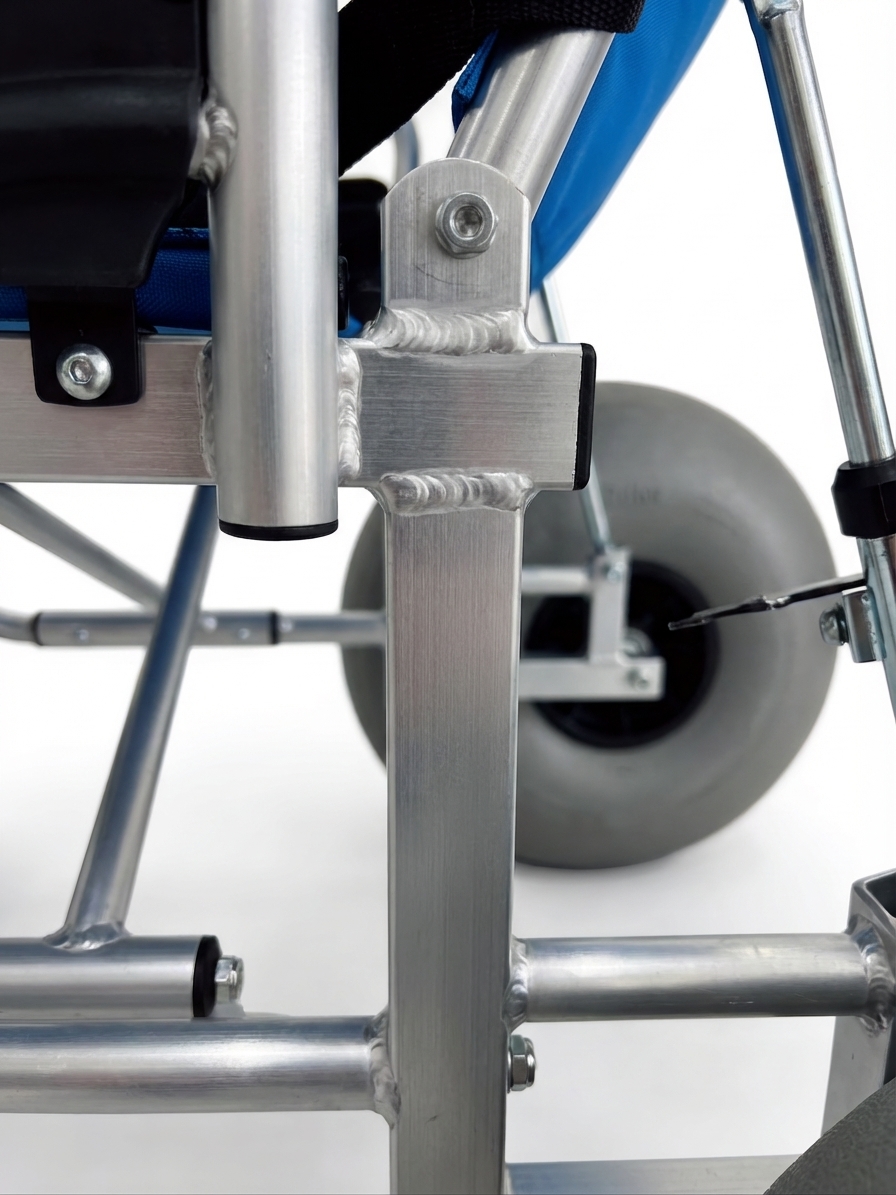 An aluminum frame is significantly better for saltwater environments because it naturally resists the rapid oxidation and structural failure that plague steel-based All-terrain beach wheelchair models. The high-strength, silver-finished chassis is engineered to withstand constant exposure to humidity, salt spray, and direct immersion without compromising the integrity of its joints.