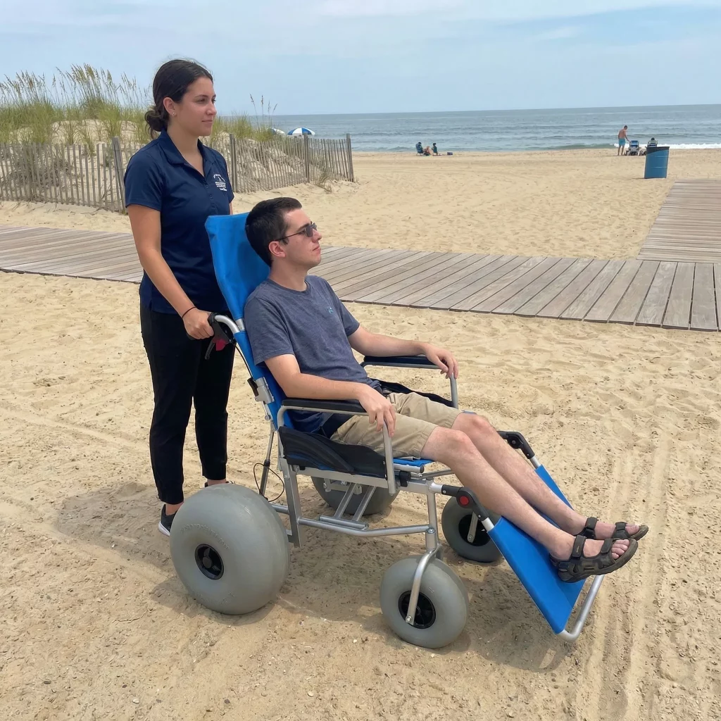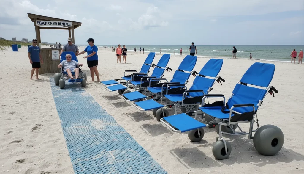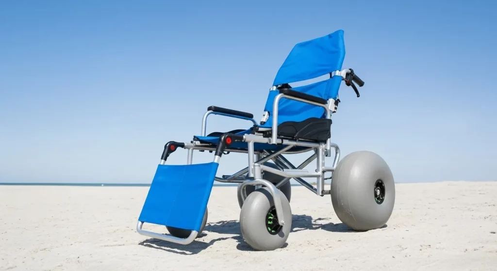 Specialized equipment like the all-terrain beach wheelchair (featuring a black frame, blue accents, and grey balloon tires) completes the accessibility loop. These chairs take you where the mats end, allowing you to touch the water and move freely across the entire beach. Here’s the deal: