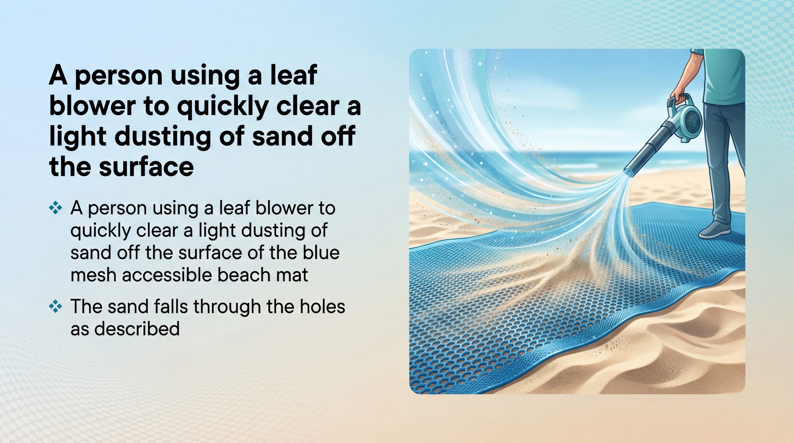 The maintenance for an accessible beach mat is remarkably low, requiring only periodic sweeping or the use of a leaf blower to clear excess sand from the surface. Because the mesh is permeable, most sand falls through the holes naturally, keeping the path clear for users without constant intervention.