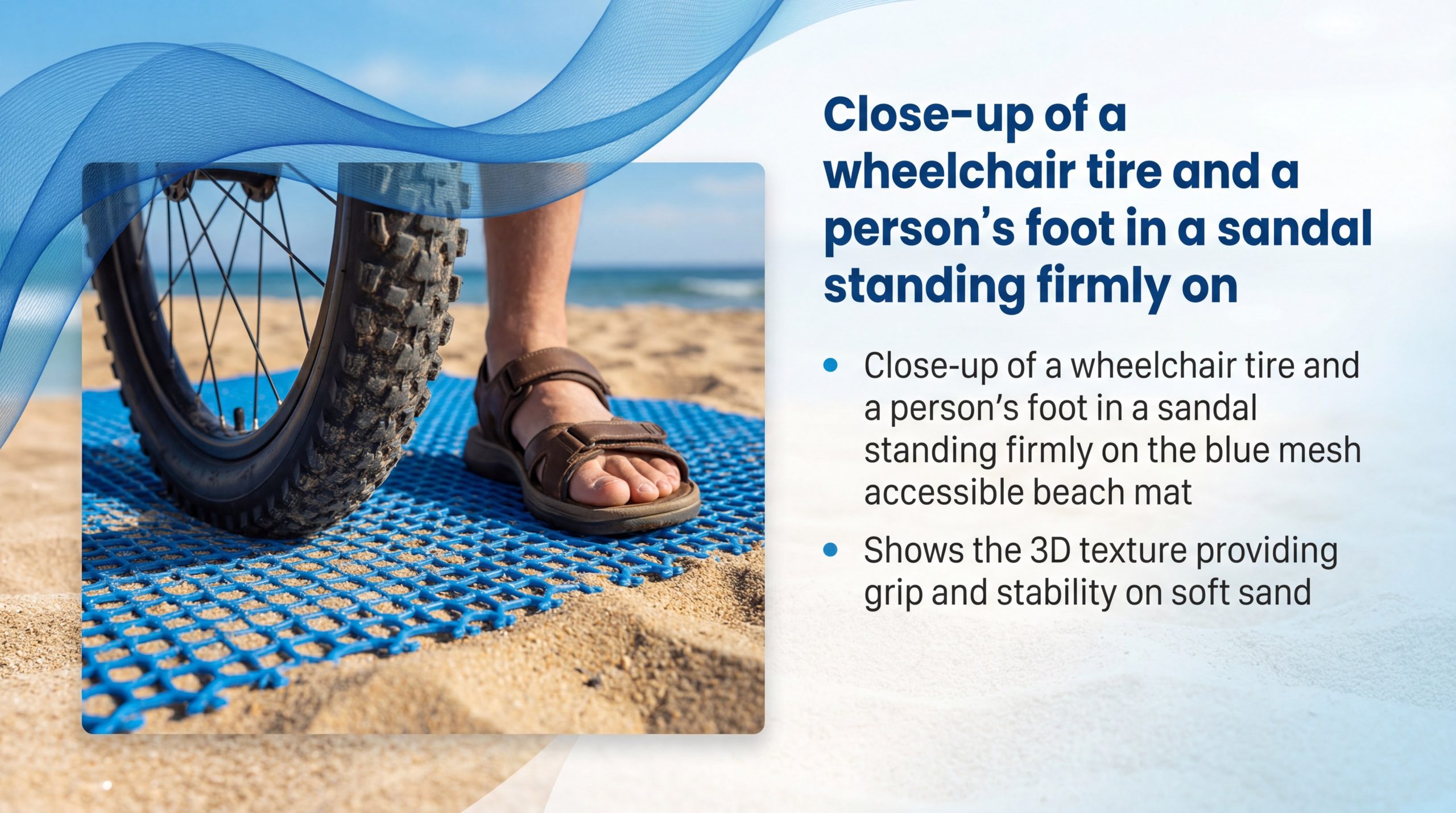 An accessible beach mat provides superior nonslip protection through a patented 3D mesh design that creates a high-traction surface for wheels and feet alike. This specialized texture is essential for preventing accidents in environments where sand and water create slippery conditions.