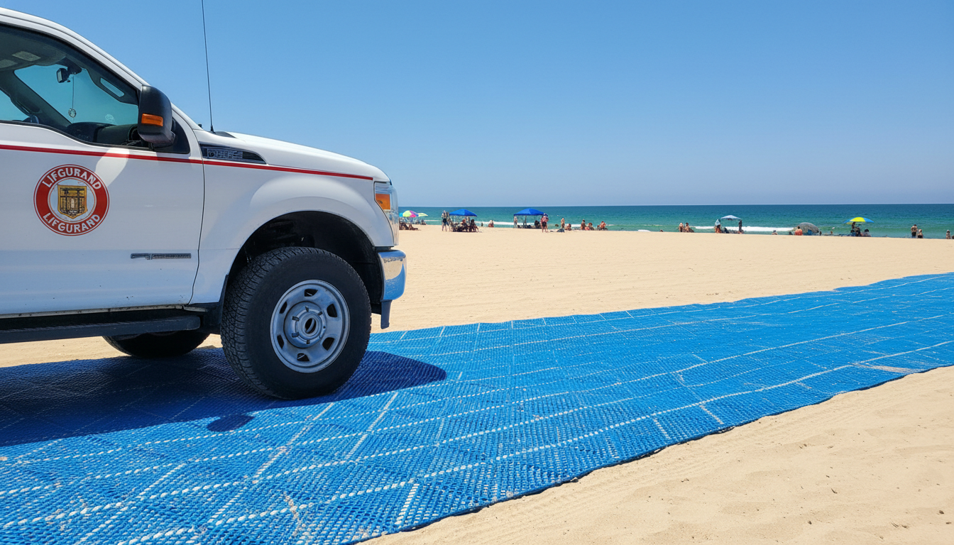 High-quality modular mats are designed to withstand the point-load pressure of utility vehicle tires. This allows emergency responders to move quickly across the sand while maintaining the integrity of the accessible path.