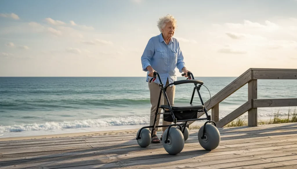 The transition point where the pavement ends and the sand begins is often where most people get stuck. These rollators handle this shift effortlessly thanks to their large-diameter wheels.