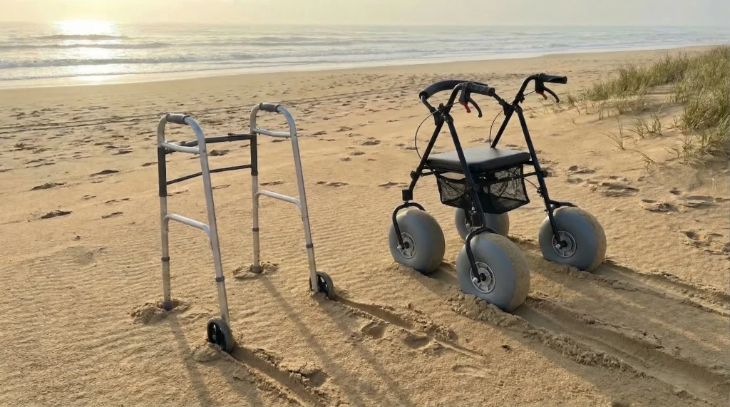 For semi-ambulatory users, beach walkers offer a more active and health-conscious alternative to traditional wheelchairs. While chairs are excellent for full transport, walkers encourage the user to maintain their muscle strength and balance through active movement. You can find many applications where a rollator is the preferred choice for rehabilitation and fitness.